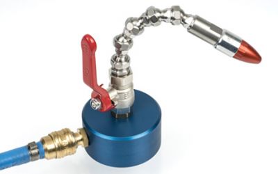 Neue Befestigungen und Luftzuleitungen für Druckluftdüsen: die magnetische FixBase "M" (Art.-Nr. 2454) und die schraubbare FixBase "S" (Art.-Nr. 2455)